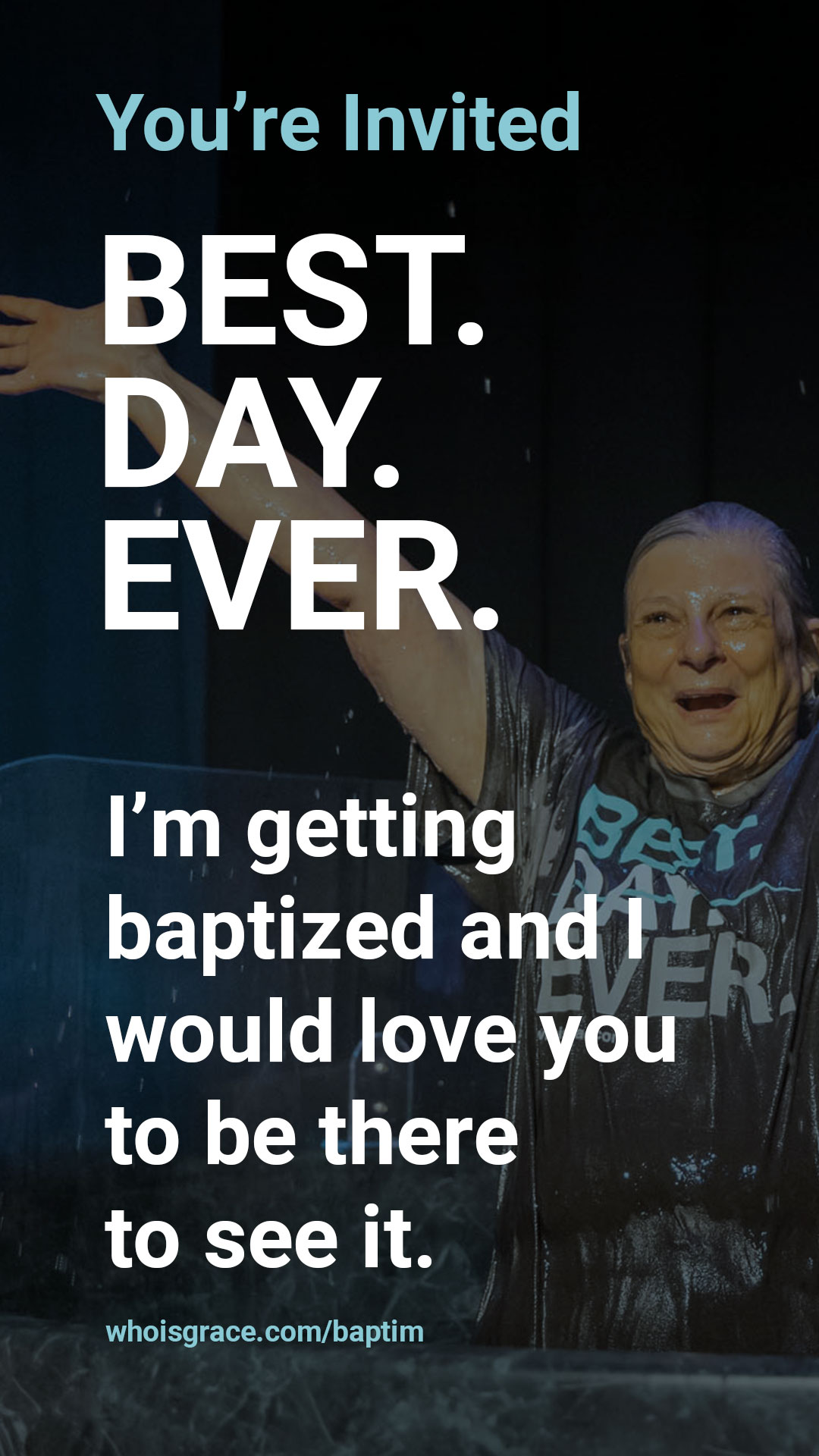Hey ______! I’ve been attending Grace Church and I’ve decided to get baptized on DATE. My faith has become really important to me and it would mean a lot if you would come watch my baptism. The service starts at TIME. Let me know if you can make it!